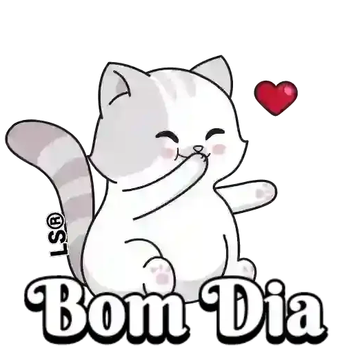 A gray cartoon cat with closed eyes and its paw to its nose, a red heart beside it, and 'Bom Dia' written below.