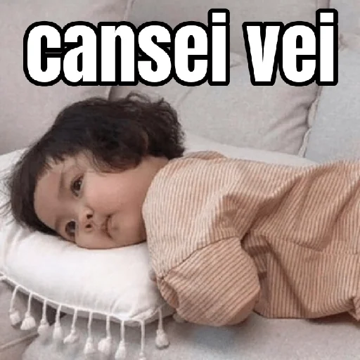 A girl lying on a white pillow with a sleepy expression, wearing a pink sweater. The image features the text "cansei vei" in large letters.