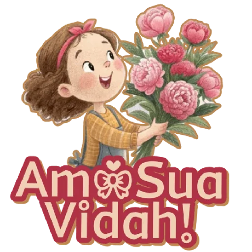 A girl with a pink hair bow and yellow sweater holds a bouquet of pink flowers and says 'Amor Sua Vida!' in large, red letters.