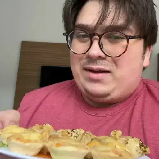 A man with glasses and a pink shirt holds a plate of food, possibly a type of pastry or empanada.