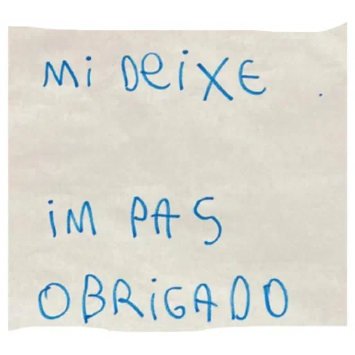 A piece of paper with the words 'Mi Deixe iM pAs OBRiGADO' written in blue, in an irregular and childish manner.