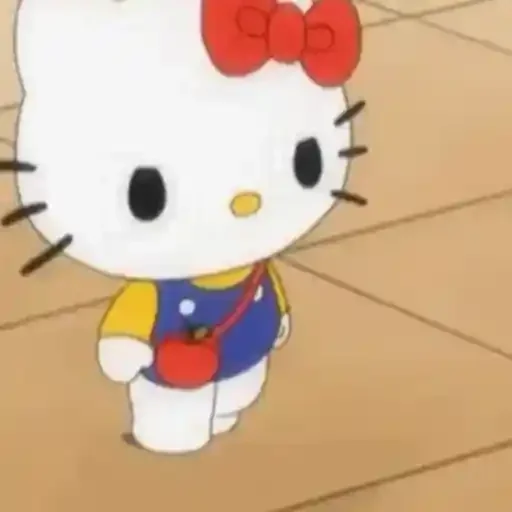 Rosto de Hello Kitty com um laço rosa, fazendo um gesto com a mão e com dois triângulos rosas atrás da cabeça.