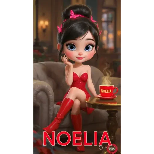 A woman with black hair and pink bows sits on a sofa wearing a red dress and boots, next to a coffee cup. She has her hand on her face and her name 'Noelia' is written below.