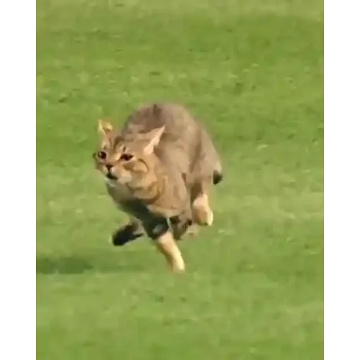 A brown cat running on green grass.