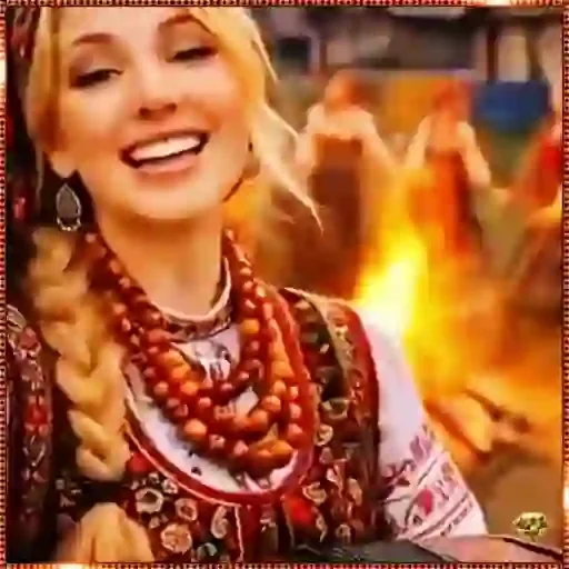 Mulher com os olhos fechados e sorriso, usando um lenço colorido na cabeça e um vestido tradicional, com texto 'В…
