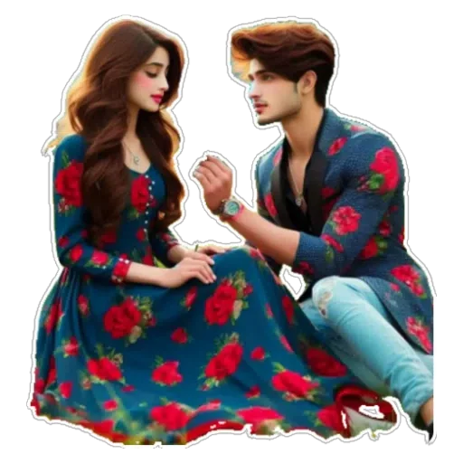 A young couple, a man and a woman, sitting together. Both wear blue clothes with red rose prints.