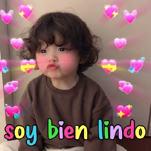 Little boy with a serious facial expression, surrounded by colorful hearts and the text 'soy bien lindo' in colorful letters.