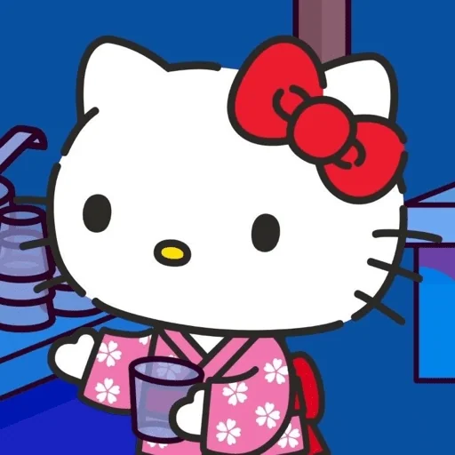 Rosto de Hello Kitty com um laço rosa, fazendo um gesto com a mão e com dois triângulos rosas atrás da cabeça.