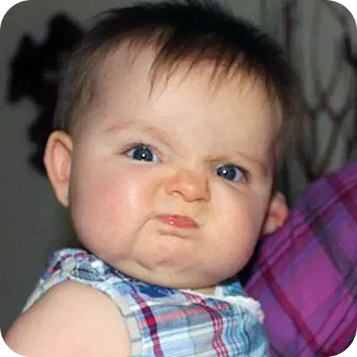 Baby with a serious expression, brown hair and blue eyes, wearing a blue, red, and white plaid shirt.