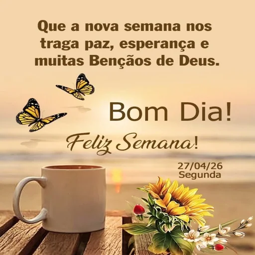 Um cartão com a mensagem 'Que a felicidade tome conta de tudo o seu dia. Bom dia!' ao lado de um girassol, uma rosa…