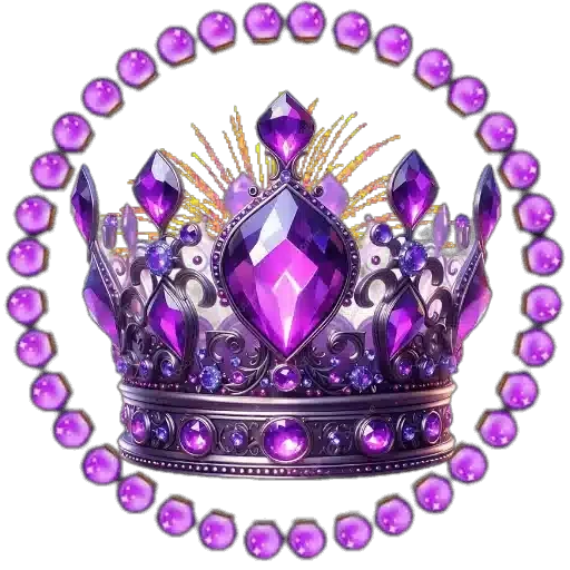 Purple and royal crown with gold details. The crown is adorned with precious stones and surrounded by a double circular row of purple gems.