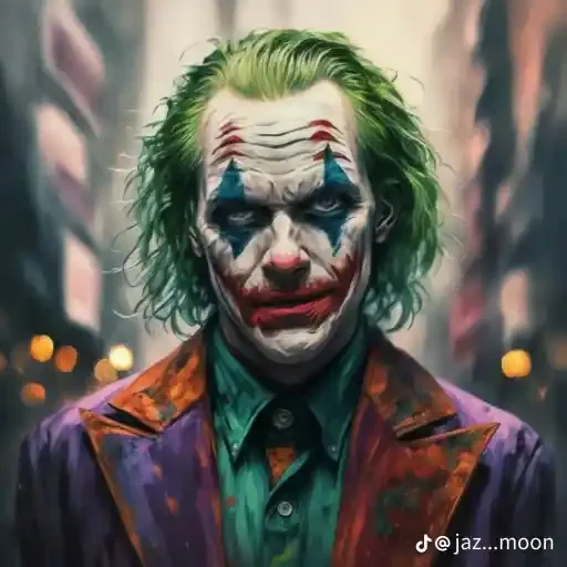 O Coringa, interpretado por Heath Ledger, com maquiagem branca no rosto, olhos escuros e sorriso vermelho.