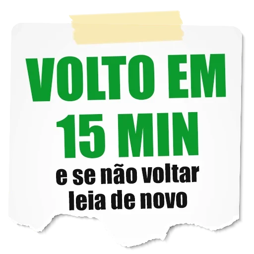 A white piece of paper with a yellow strip at the top, green text 'VOLTO EM 15 MIN' and black text 'e se não voltar leia de novo'.