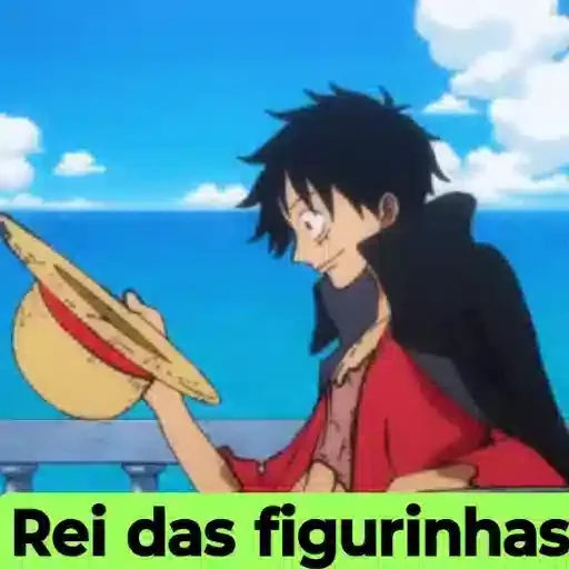 Anime character with long black hair, wearing a red coat, holding a straw hat in front of the sea with white clouds in the sky. The image features the text 'Rei das figurinhas' at the bottom.
