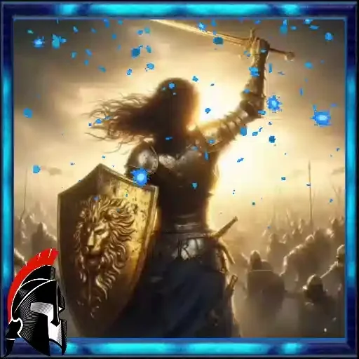 A warrior in armor with long hair holds a shield and sword in a battle scene, with light and blue particle effects.