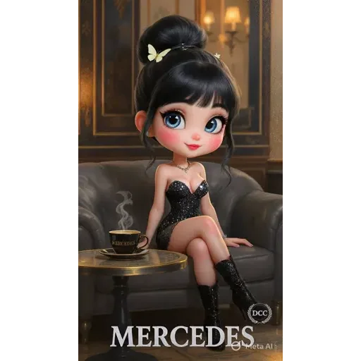 Uma menina de olhos azuis e cabelo preto sentada em um sofá, vestindo um vestido preto. Ela está com um copo na mão e…