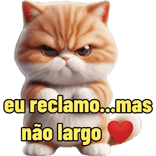 Orange cat with a serious expression and text 'eu reclamo...mas não largo' in yellow, with a red heart next to it.