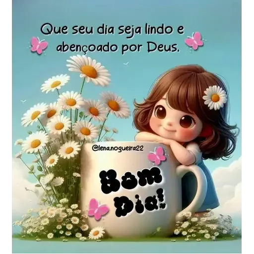 A brown-haired girl with a flower in her hair next to a bouquet of flowers and a cup with 'Bom Dia!' written on it, with the phrase 'Que seu dia seja lindo e abençoado por Deus' above.