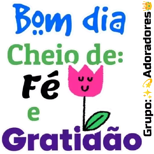 A pink flower with a happy face and the words 'Bom dia Cheio de: Fé e Gratidão' in different colors.