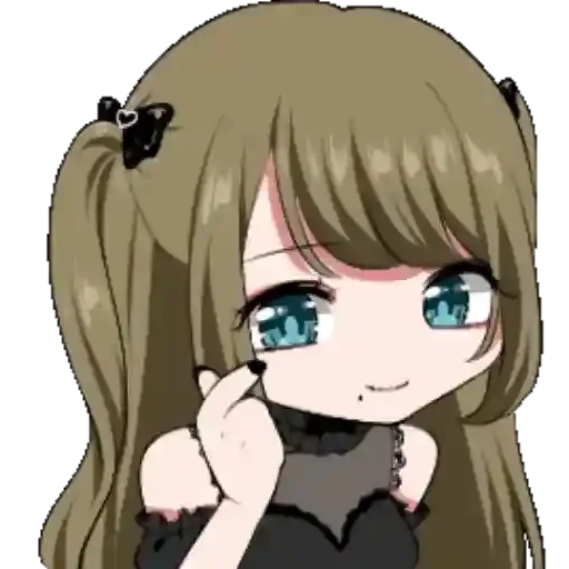 Anime girl with brown hair and blue eyes, wearing a black outfit, making a gesture with her hand.
