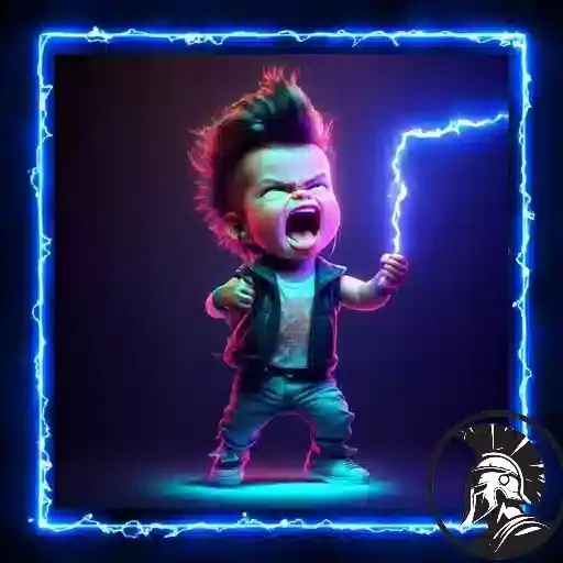 Anime boy with spiky hair, closed eyes, and open mouth, screaming, holding a lightning bolt. He's inside a frame with a blue light outline.