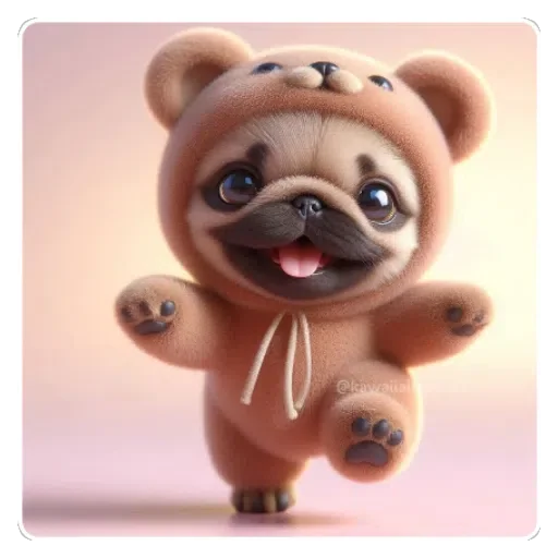 A cute little pug dog wearing a bear onesie, with big eyes and a cheerful expression.
