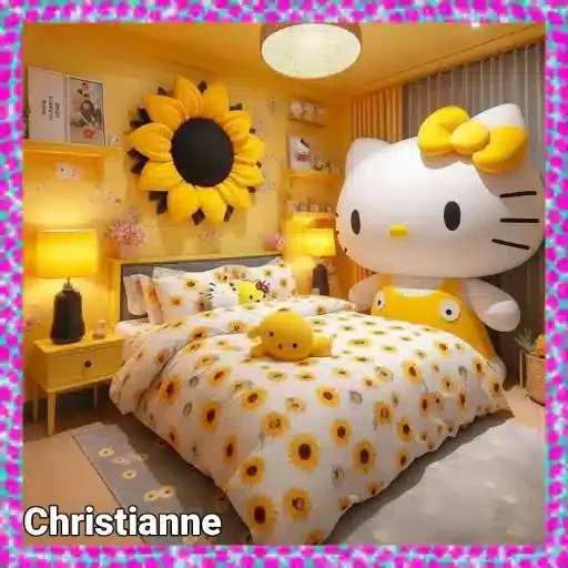 A child's bedroom with a bed covered in white and orange flowered sheets, a plush toy, and a large Hello Kitty doll wearing yellow beside it. The wall has a sunflower picture.