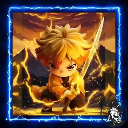 Personagem de anime com cabelo loiro e chifres laranja, usando armadura dourada e segurando uma chama, com fundo escuro…
