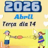 Uma figurinha colorida com o texto 'ABRIL TERÇA DIA 14 2026' em letras grandes e decorativas, com efeito de neve nas…