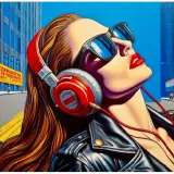 fones de ouvidomujerheadphonescityMulher loira usando óculos de sol e fones de ouvido vermelhos em um cenário urbano.Added on April 19, 2026·Illustration · Fillermusicaurbanomulher