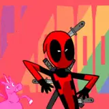 Deadpool, o personagem de quadrinhos, usando máscara vermelha e traje de couro, com duas espadas nas costas.