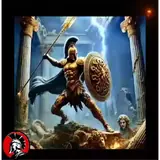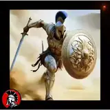 Um guerreiro espartano com armadura dourada e preta, capacete com pluma amarela, segurando uma lança em meio a um…