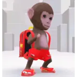Um macaco de pelúcia marrom com uma mochila vermelha e shorts vermelhos, parecendo um estudante, em um ambiente urbano…
