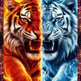 decorativodualDois tigres ferozes, um laranja e um azul, com bocas abertas e olhos penetrantes, divididos por uma linha vertical, em…Added on April 19, 2026·Illustration · Reactiontigreanimaisferoz