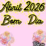 Um fundo rosa com fogos de artifício coloridos e o texto 'Abril 2026 Bom Dia' em letras pretas com contorno amarelo. No…