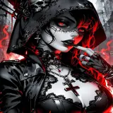 cruzojo rojogothUma mulher com maquiagem gótica e um capuz preto, olhos vermelhos, crucifixo no peito e fundo de chamas vermelhas.Added on April 19, 2026·Illustration · Reactiongoticmujerfuego