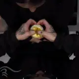 Mãos formando um coração com um hambúrguer dentro, com tatuagens nos braços e fundo escuro.