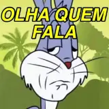 Bugs Bunny com expressão facial séria e braço na frente da boca, falando "OLHA QUEM FALA" em letras amarelas.