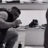 examinarUm homem ajoelhado diante de uma prateleira de sapatos, examinando um par.Added on April 14, 2026·Illustration · Reactionhomemsapatosreacao