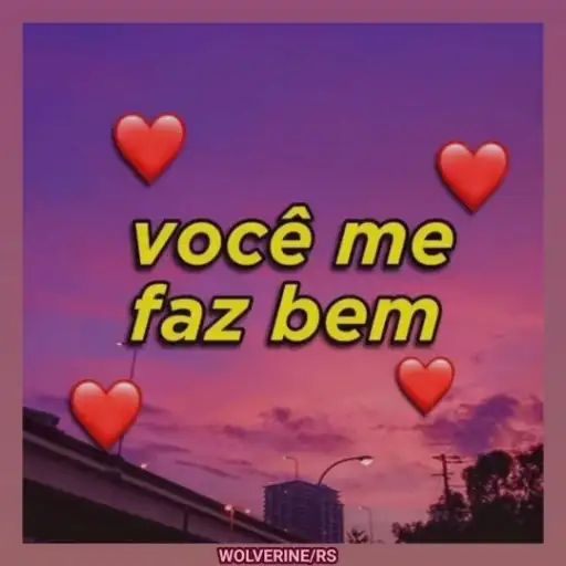 Céu rosa e roxo ao pôr do sol com texto 'você me faz bem' em amarelo e quatro corações vermelhos.