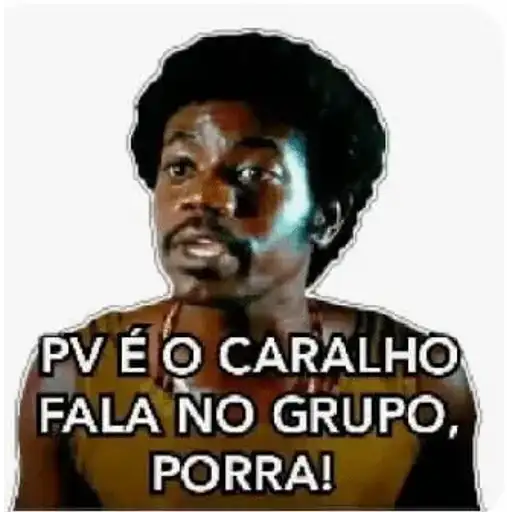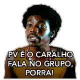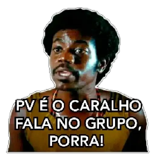 Um homem negro com expressão séria e cabelo afro, vestindo uma camiseta laranja e um colar, com o texto 'Bom dia porra…