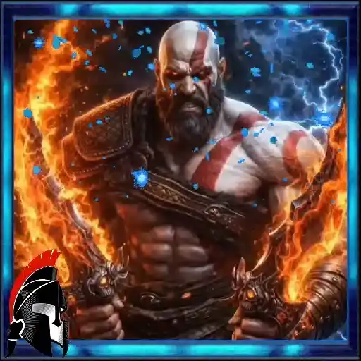 Um homem musculoso e careca com uma faixa vermelha no peito e testa, cercado por chamas e raios azuis.
