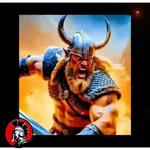 Um homem musculoso com cabelos e barba longos e ondulados, vestido com armadura, segura uma espada e emite uma aura de…