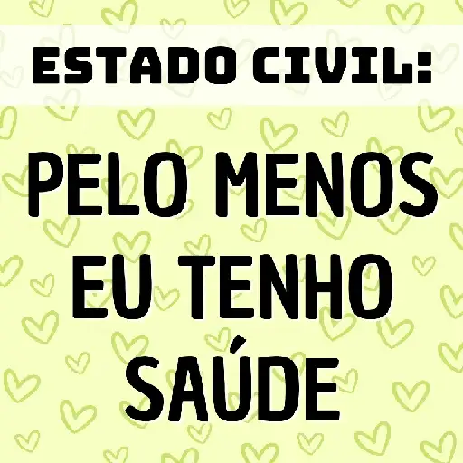 Um fundo amarelo claro com corações verdes, com um texto em preto que diz 'ESTADO CIVIL: PELO MENOS EU TENHO SAÚDE'.