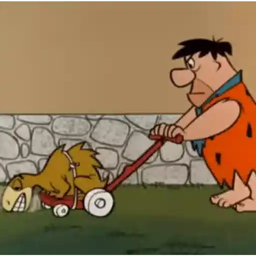 O personagem Fred Flintstone empurrando um cortador de grama com o pé de seu cachorro Dino preso nele. O cenário inclui…