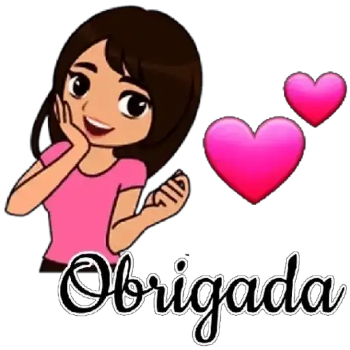 Uma menina de cabelo castanho e camisa rosa, com as mãos no rosto e dois corações rosa ao lado, e a palavra 'Obrigada'…