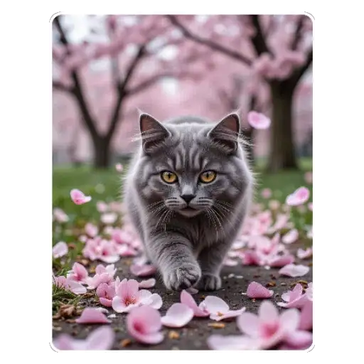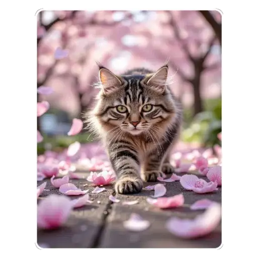 Gato fofinho de pelo comprido, cor marrom, laranja e branca, com folhas de flor de cerejeira caindo ao redor.