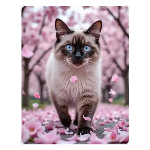 Gato siamês com olhos azuis brilhantes e pelagem bege e marrom escura, caminhando em meio a pétalas de flores…