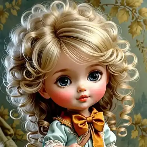 Menina com cabelo castanho ondulado e macio, vestindo um macacão azul e uma blusa branca, com bochechas rosadas e olhos…