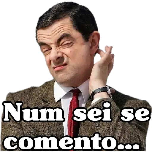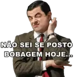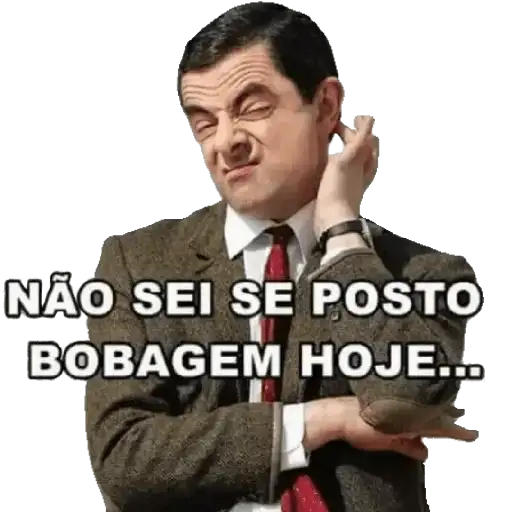 Esta colección presenta imágenes divertidas del personaje Mr. Bean, conocido por sus expresiones faciales y gestos cómicos. Las imágenes muestran al actor Rowan Atkinson caracterizado como el personaje, con expresiones faciales y posturas graciosas, algunas con subtítulos en portugués.